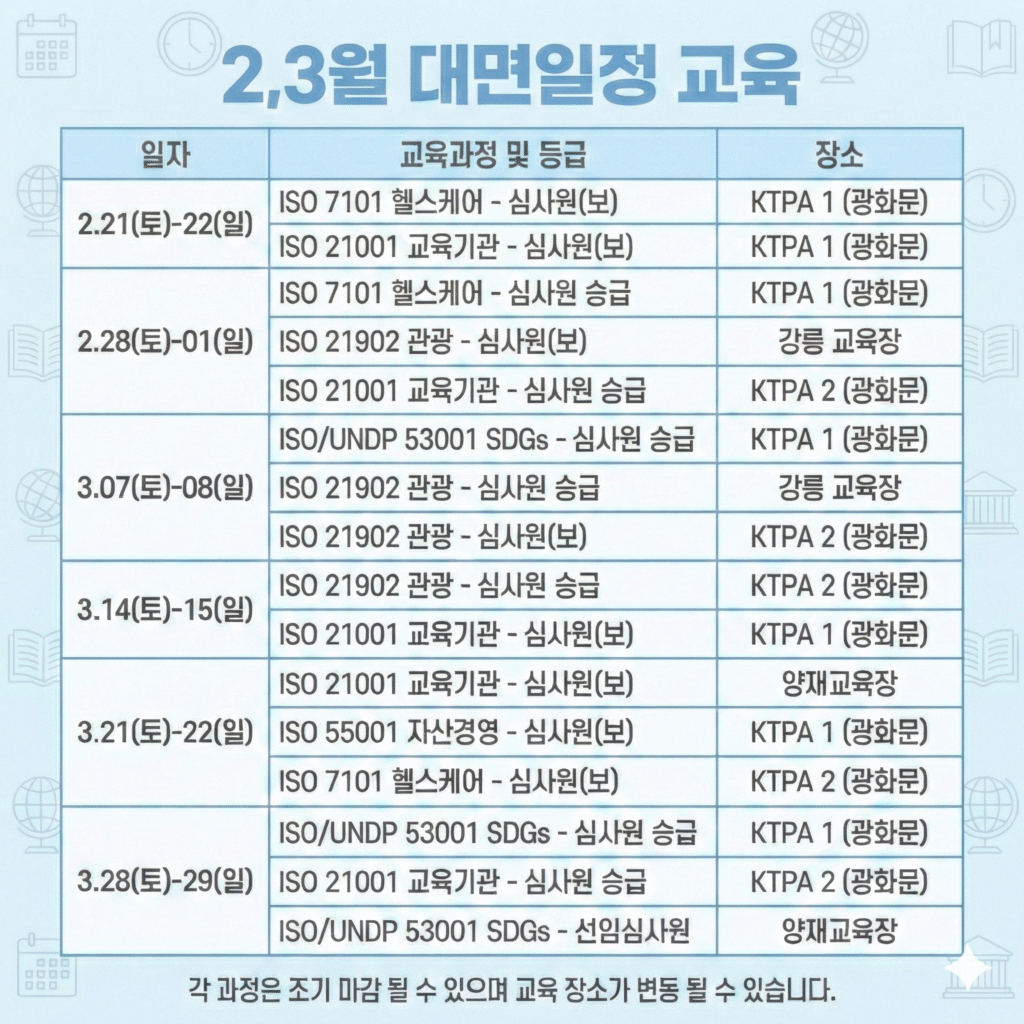 - ISO 9001, 14001, 45001, 21902, 7101, 42001, 19011, ESG 심사원 등 교육